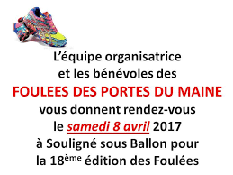 Les foulées des portes du Maine restent maintenant incontournables au calendrier des courses hors stade dans notre département. Le Mans Athlétisme 72 sera bien sûr à nouveau au cœur de cet évènement, notamment, par la présence de nos bénévoles sur la partie logistique. J’adresse tous mes vœux de succès à l’équipe organisatrice pour cette nouvelle édition et je sais déjà qu’elle sera réussie comme toutes les précédentes. J’invite donc tous les amoureux du bitume à venir nous rejoindre samedi 8 avril 2017 pour partager tous ensemble un nouveau moment de grande convivialité à Souligné sous Ballon, sans oublier non plus les athlètes du sport adapté invités à participer à ces foulées.