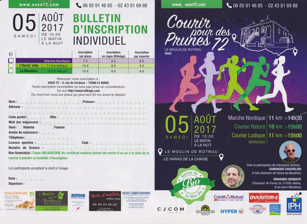 Trois épreuves de courses à pied "Courir pour des Prunes" organisé par ASSO 72 avec la présence d’Athlètes régionaux de haut niveau. Dominique Chauvelier ( 4 fois champion de France de marathon) et Mohamed Serbouti (champion de France du 10000m et semi-marathon)