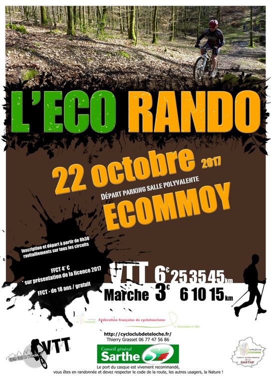 Le Cyclo Club de Téloche organise le dimanche 22 octobre 2017 la 3ème ECO RANDO avec 3 Circuits VTT 25, 35 et 45 km et 3 circuits marche 6, 10 et 15 km.