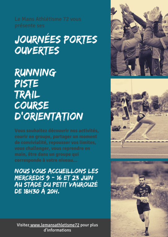 Nous vous proposons de venir nous rencontrer à nos journées portes ouvertes les 9, 16 et 23 juin afin de participer à un entraînement de trail et/ ou de running au stade du petit Vaurouzé de 18h30 à 20h