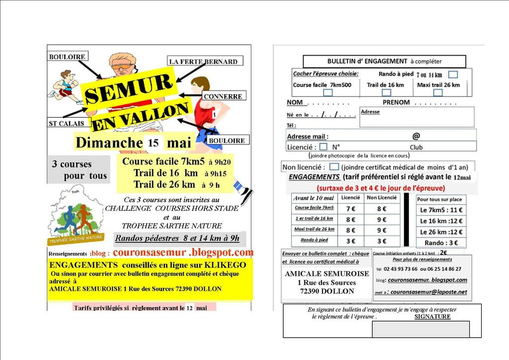 ( de 7 à 9 €) conseillés en ligne sur site KLIKEGO (date limite le 12 mai ) ou à la rigueur par voie postale à AMICALE SEMUROISE 1 rue des sources 72390 DOLLON , tél 0625148627.