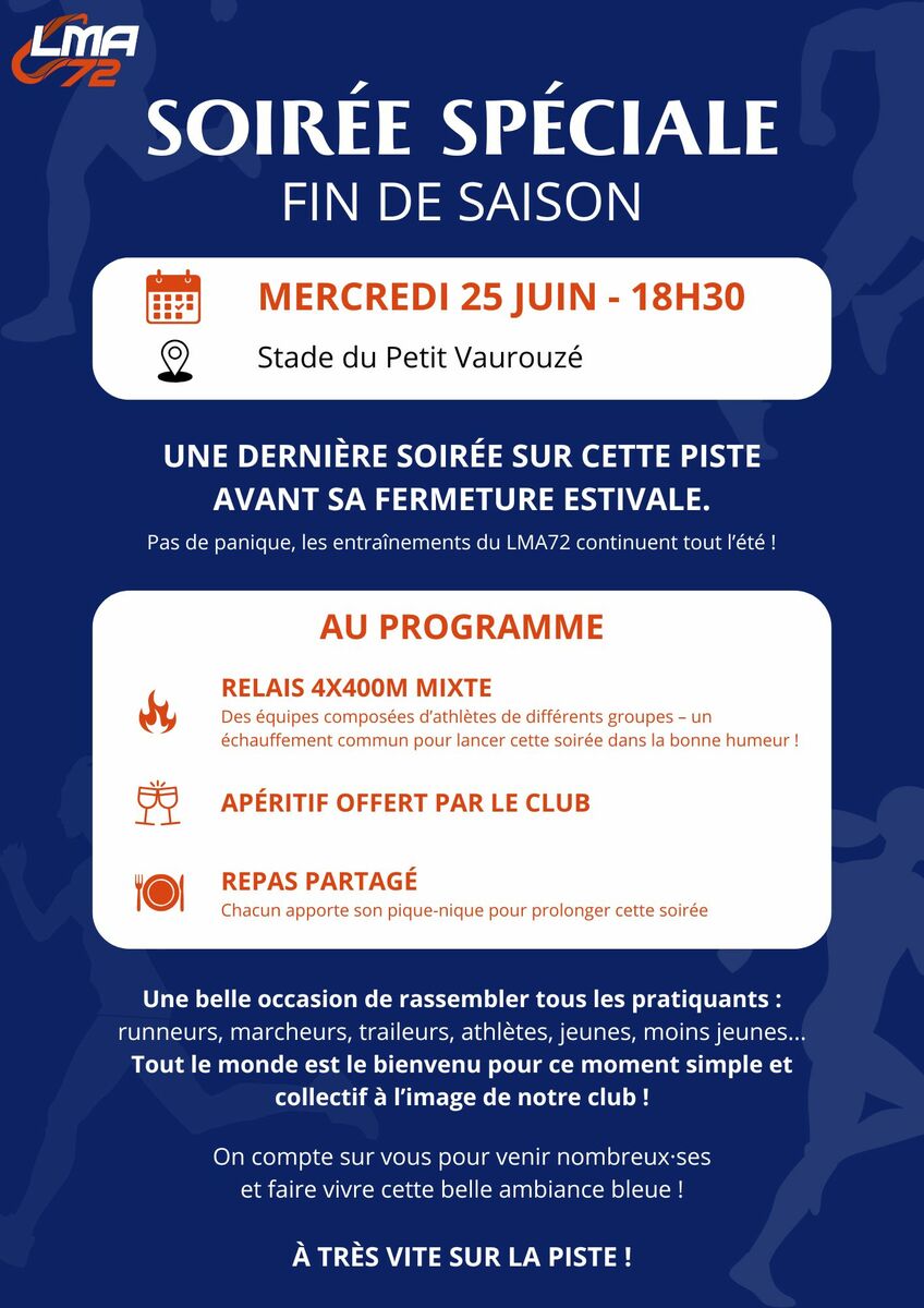 Le mercredi 25 juin Ă 18h30, on vous donne rendez-vous au stade du Petit VaurouzĂ© pour une soirĂ©e un peu spĂ©ciale, histoire de marquer la derniĂšre journĂ©e sur cette piste avant sa fermeture estivale (mais pas des entraĂźnements, rassurez-vous, le LMA72 continue tout lâĂ©tĂ© đ).